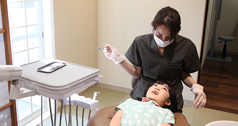 虫歯治療やフッ素塗布はもちろん、身体の成長に合わせた矯正治療や舌や唇の機能療法も行います。治療が苦手なお子さまには、治療に使う道具やプラスチックを触って遊ぶところからはじめましょう。